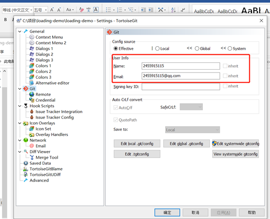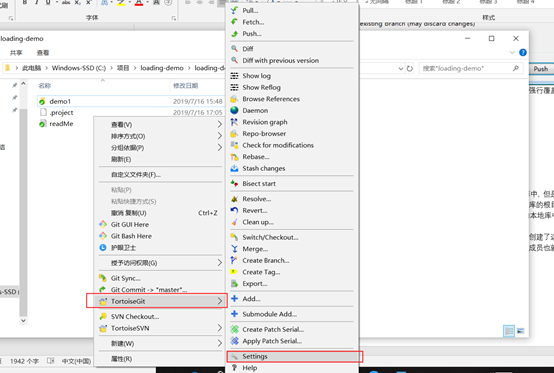 1、 找到在github上拉取到本地的文件夹,右键找到小乌龟选择设置;