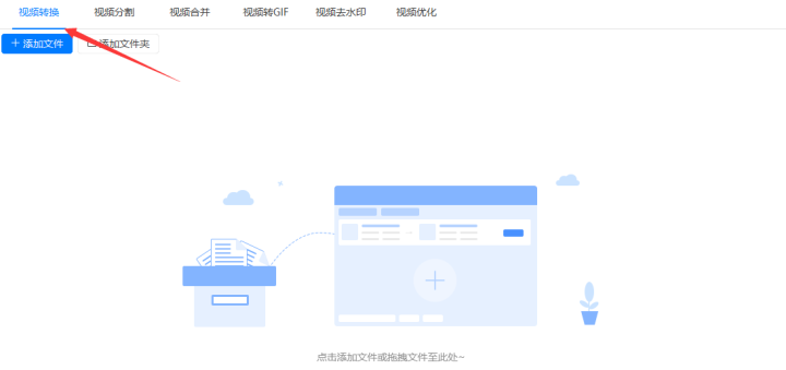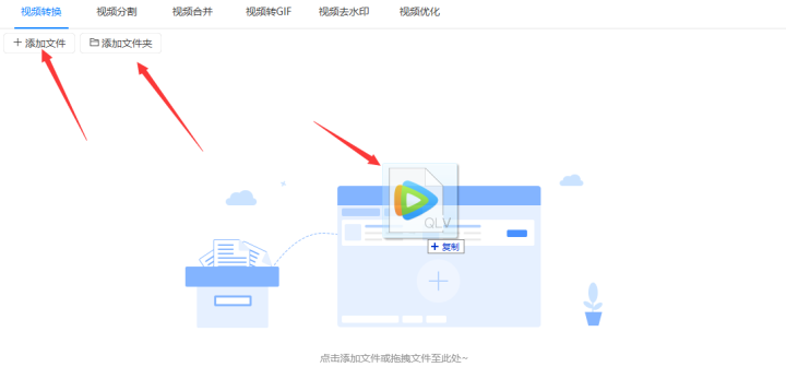 2、把功能调为“视频转换”后需要把qlv格式的视频添加到软件中,添加到时候可以点击左上角的“添加文件”或者“添加文件夹”按钮进行添加,如果不想点击左上角的两个按钮的话软件也支持直接把需要转换的视频拖拽到软件中。