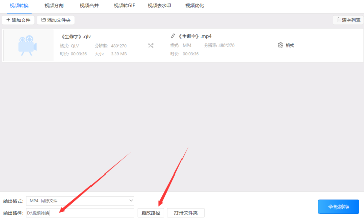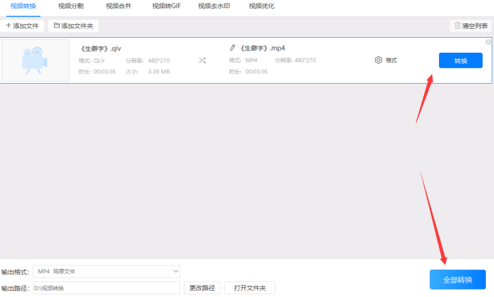 5、以上都设置好后好后点击软件右上角的“转换”或者右下角的“全部转换”按钮把qlv格式转换成mp4格式。