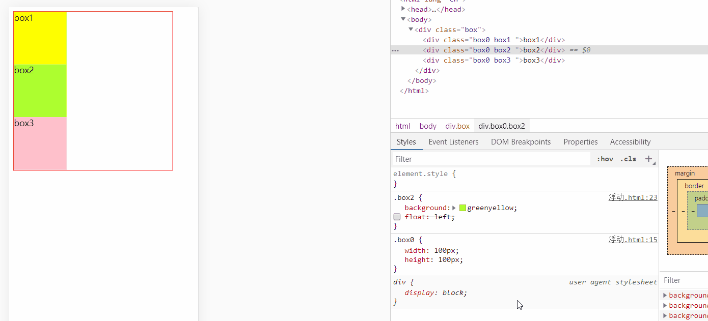 4.如果多个元素浮动了,那么这们就会并排显示,如果都是同一个方向的浮动,它们会紧紧地贴在一起。