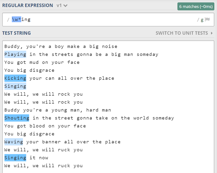 这里建议读者看的过程中,同时打开该网站,把歌词贴进去,每个案例都验证一遍。也建议稍微改动一下正则,看看匹配结果仍是否与自己的理解一致。跟着动手,学习效果要好一些。