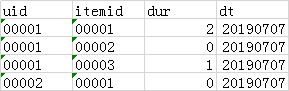 uid: 用户标识,itemid:文章id,dur: 阅读文章时长,如果大于 0 代表阅读了文章,等于 0 代表没有点击文章