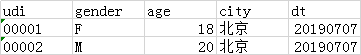 uid:用户标识,gender:性别,F 代表女,M 代表男,age:年龄,city:城市
