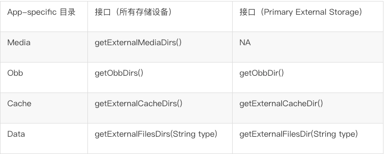 无需任何权限,APP 即可直接使用文件路径来读写自身 App-specific 目录下的文件。获取 App-specific 目录路径的接口如下表所示。
