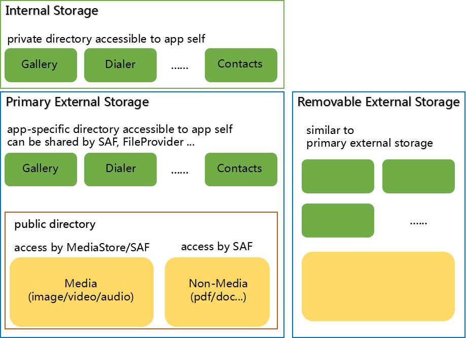 APP 可以通过 SAF(System Access Framework)、MediaStore 接口访问其中的文件。