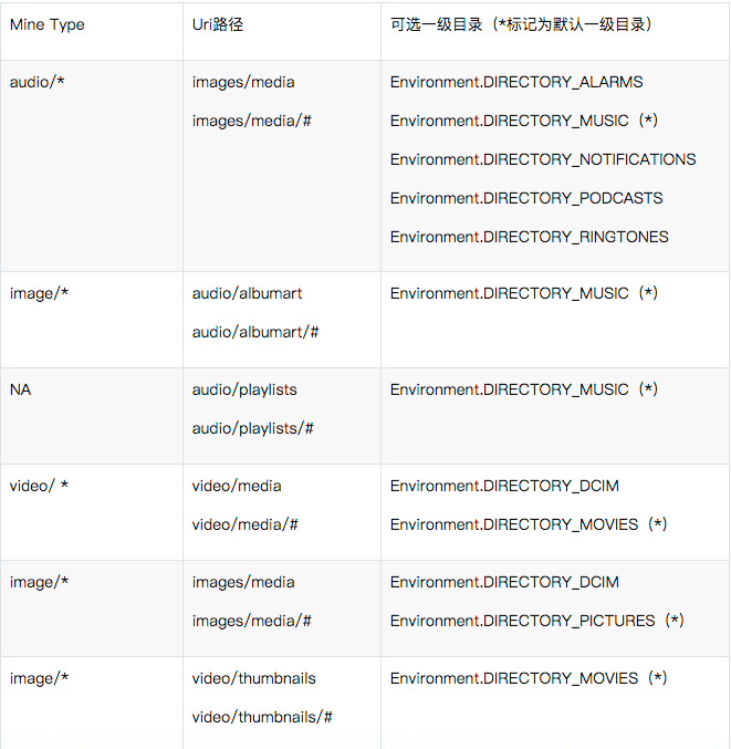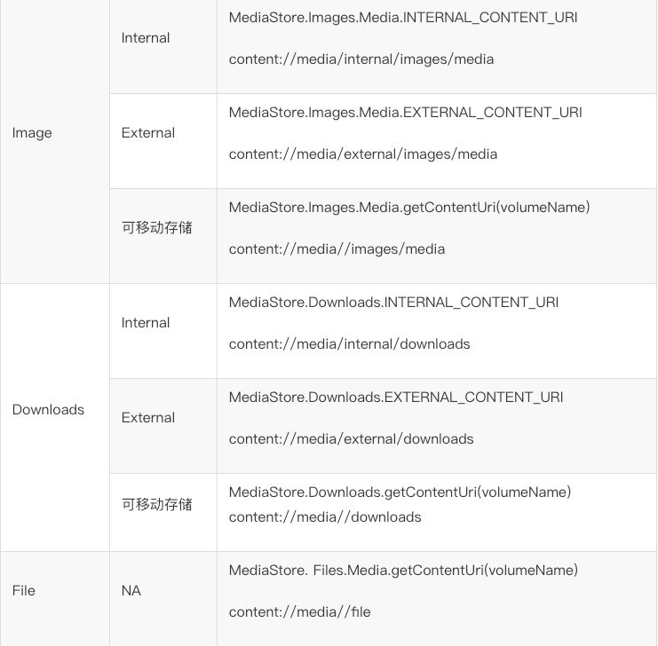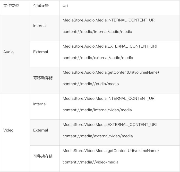 下列每种类型又分为三种 Uri:Internal、External、可移动存储。