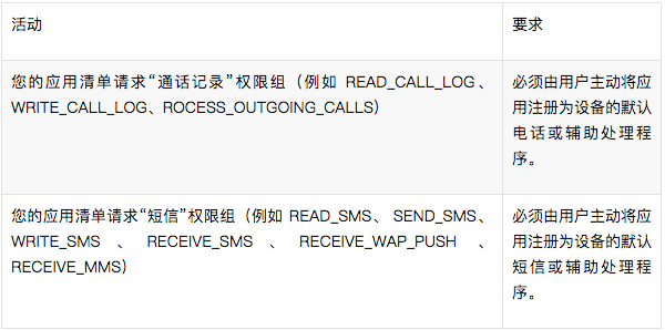 ● 只有在用户主动将应用注册为默认短信、电话或辅助处理程序的情况下,应用才能提示用户接受上述任何权限请求;当应用不再是默认处理程序时,则必须立即停止使用相应权限。