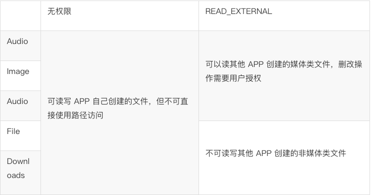 Android Q 仍然使用 READ_EXTERNAL_STORAGE 和 WRITE_EXTERNAL_STORAGE 作为面向用户的存储相关运行时权限,但现在即使获取了这些权限,访问外部存储也受到了限制。APP 需要这些运行时权限的情景发生了变化,且各种情况下外部存储对 APP 的可见性也发生了变化。