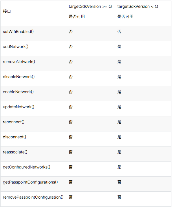 Android Q 为了更好的保护用户的隐私,让用户知晓应用对 Wi-Fi 配置的改动,其限制了应用对 WifiManager 重要接口的调用,三方应用将无法正常使用这些接口。此外,针对 Wi-Fi Direct 相关的广播以及接口也做了调整。