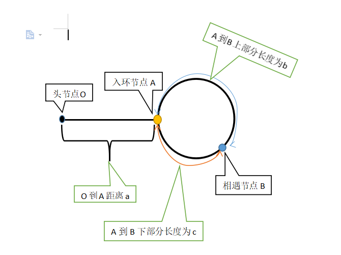 注:为了理解方便,把长度 b 定为上半部分长度,实际上 b 应该为快慢节点相遇时慢节点绕过环形链表的总长度