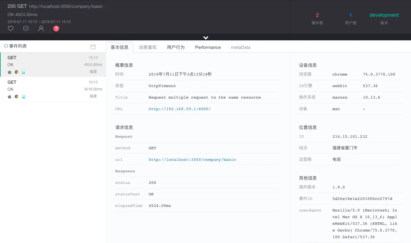 点开错误详情,可以看到具体的报错信息。一个请求耗时 3018 毫秒,一个请求耗时 4525 毫秒。
