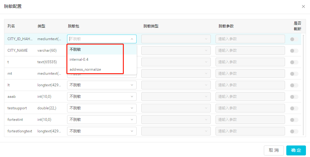 - 数据实时脱敏: 可根据需求对指定列数据进行实时脱敏。脱敏策略包括:直接替换、MD5、murmur等脱敏算法,脱敏加盐,正则表达式替换等。支持用户开发jar包实现DBUS未覆盖的个性化脱敏策略。