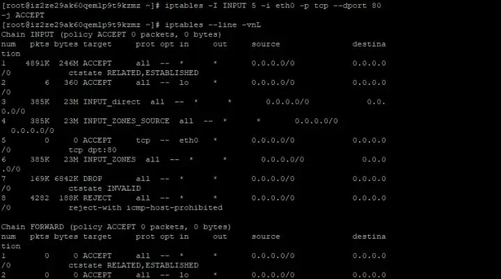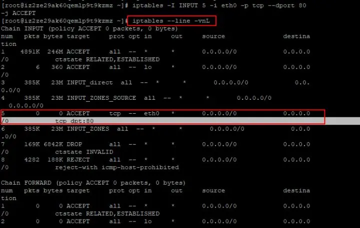 1:修改系统防火墙配置文件,在第五行配置中增加允许80端口监听外来ip