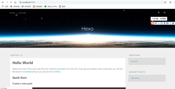 可以看到,已经用用Hexo搭建了一个基础的博客了