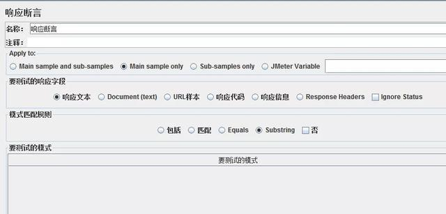 响应断言可以选择断言验证的范围(URL,响应头,响应码,响应体,响应附件),匹配的模式(纯文本还是正则表达式匹配),具体选项如下: