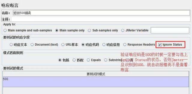 • Ignore Status: 当http 响应代码为400/500时,jmeter默认请求失败,要验返回码为500需勾选ignore status。Sampler下多个断言是叠加作用的,只要有一个断言勾选了Ignore Status就可以。
