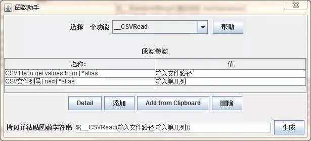 Jmeter中通过函数助手可引入CSVRead函数的支持,它有两个参数: