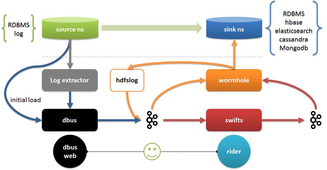 - Dbus web是dbus的配置管理端,rider除了配置管理以外,还包括对Wormhole和Swifts运行时管理,数据质量校验等。