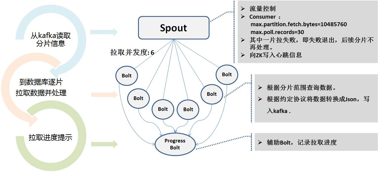 全量抽取的Storm程序是读取kafka的分片信息,采用多个并发度并行连接数据库备库进行拉取。因为抽取的时间可能很长。抽取过程中将实时状态写到Zookeeper中,便于心跳程序监控。