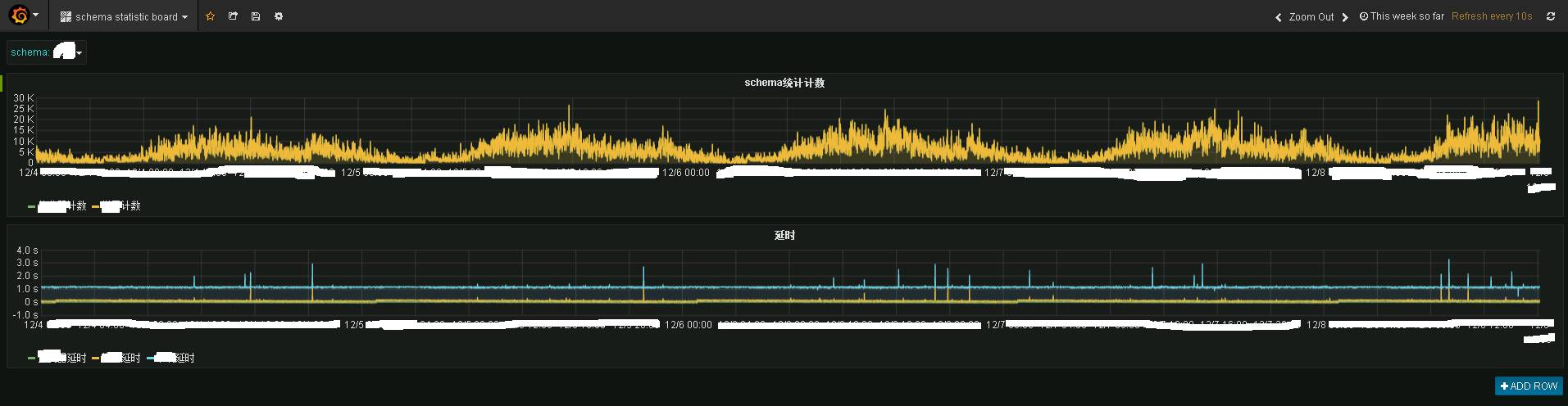 Storm程序和心跳程序将数据发送公共的统计topic,再由统计程序保存到influxdb中,使用grafana进行展示,就可以看到如下效果: