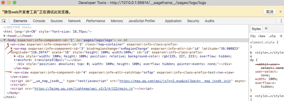 答案是使用到小程序提供的map、video、canvas、textarea等组件,页面中原生渲染的渲染原理可以参考官网原生组件。但是在小程序开发者工具中原生组件是使用html标签来模拟实现的。具体可以看下一节的map组件渲染结果。