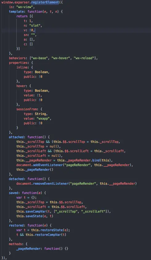 下面我们通过微信小程序开发者工具的源码来说说小程序的底层实现原理。以开发者工具版本号State v1.02.1904090的源码来窥探小程序的实现思路。如何查看微信源码,对于mac用户而言,查看微信小程序开发者工具的包内容,然后进入Contents/Resources/app.nw/js/core/index.js,注释掉如下代码就可以查看开发者工具渲染后的代码。