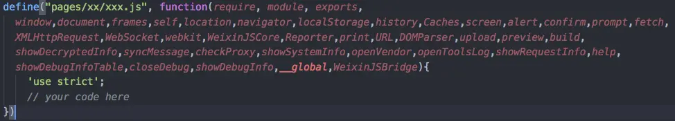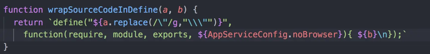 那么问题来了,小程序是怎么给业务代码加上以上封装的呢?其实很简单,在小程序开发者工具中有一个后台服务,访问小程序的每个模块的path时,后台服务会调用wrapSourceCodeInDefine方法将请求的JS文件的内容分别包裹在define域中,方法的代码如下图所示: