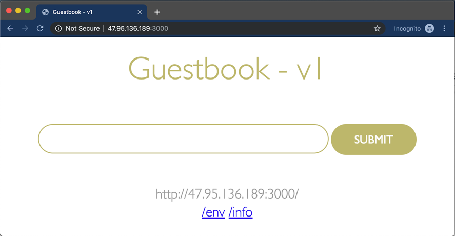 col 1col 2$kubectl get service -l app.kubernetes.io/name=guestbookNAME TYPE CLUSTER-IP EXTERNAL-IP PORT(S) AGEguestbook LoadBalancer 172.21.1.213 47.95.136.189 3000:32244/TCP 11m通过 External IP 即可访问 guestbook 服务:
