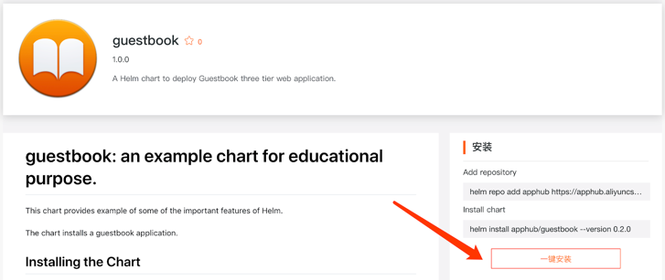 举个例子,只需打开 guestbook 应用详情页面,点击 “一键安装”: