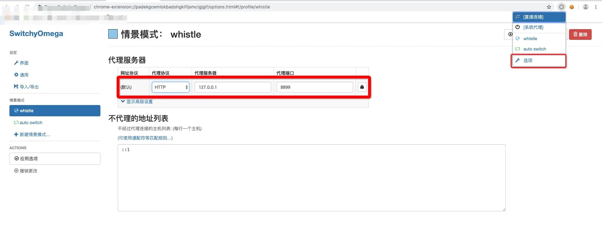 127.0.0.1 local.whistlejs.com4、都填写完毕后,打开配置页面(即 local.whistlejs.com:8899/#network)(端口号记得改成自己的)
