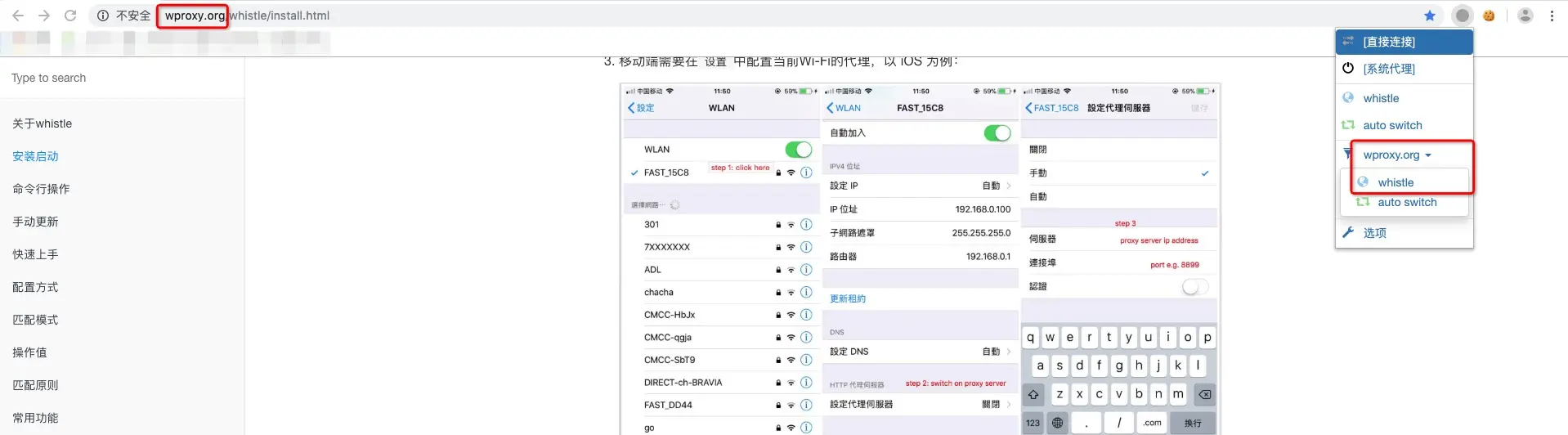 例如你要拦截官网wproxy.org/whistle/的数据,让当前网址走你刚才配置的代理服务器就OK啦