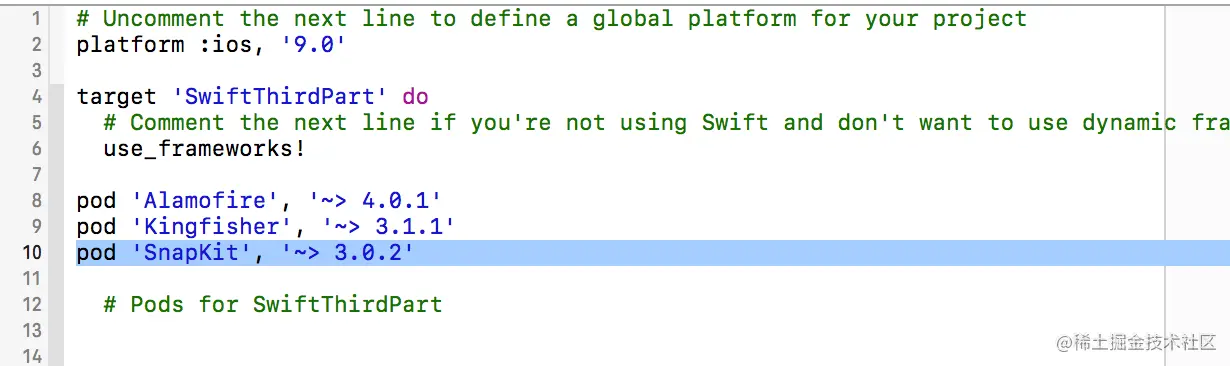 $ vi Podfile输入i进入编辑,编辑完成后按 esc 然后输入:wq按回车键 ,保存并退出 - 编辑Podfile文件 我们可以在Podfile文件中写入需要用到的第三方库按如下格式: