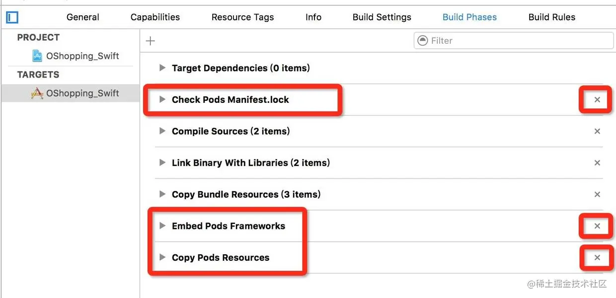 - 进入项目Build Phases,删除Copy Pods Resources、Embed Pods Frameworks和Check Pods Manifest.lock 三项