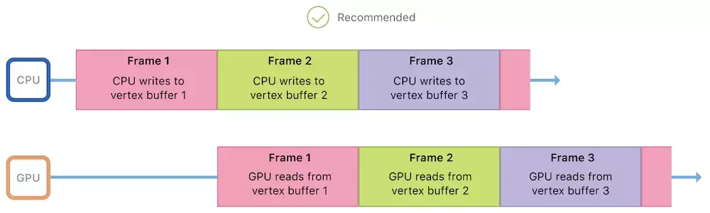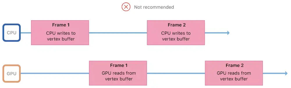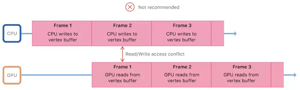 Metal旨在最大化CPU和GPU并行性,因此这些处理器应该保持忙碌并且应该同时工作。 理想情况下,GPU应该读取帧1的顶点数据,而CPU正在为帧2写入顶点数据。但是,共享单个顶点缓冲区意味着CPU可以在GPU读取之前覆盖前一帧的顶点数据,从而导致难看的渲染效果。