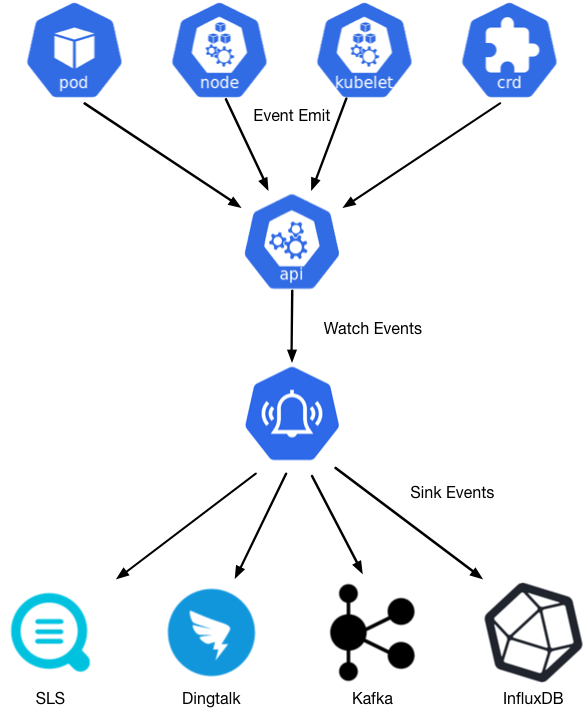 针对Kubernetes的事件监控场景,Kuernetes社区在Heapter中提供了简单的事件离线能力,后来随着Heapster的废弃,相关的能力也一起被归档了。为了弥补事件监控场景的缺失,阿里云容器服务发布并开源了kubernetes事件离线工具kube-eventer。支持离线kubernetes事件到钉钉机器人、SLS日志服务、Kafka开源消息队列、InfluxDB时序数据库等等。