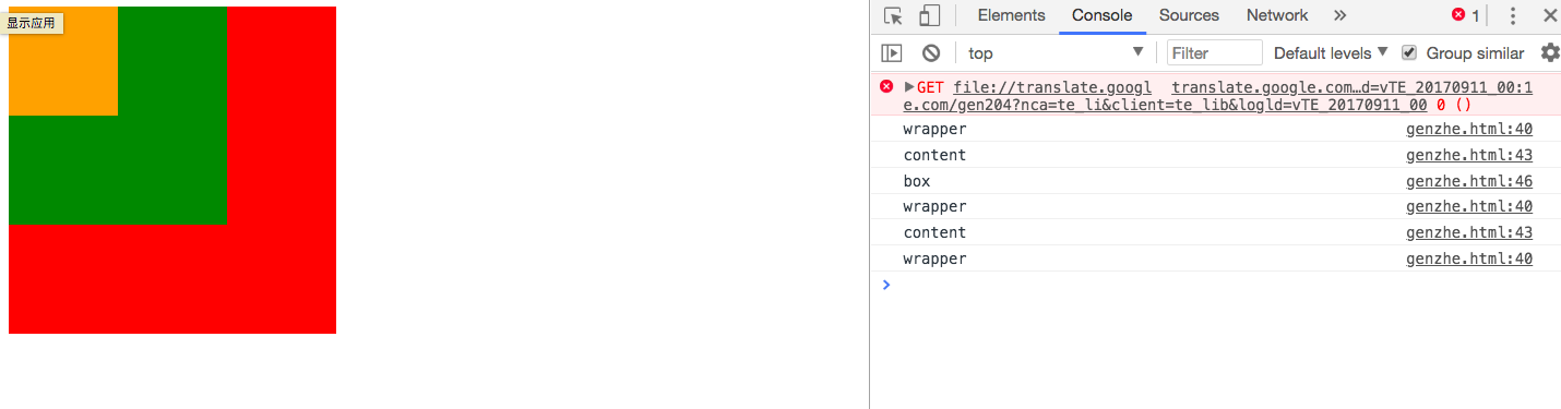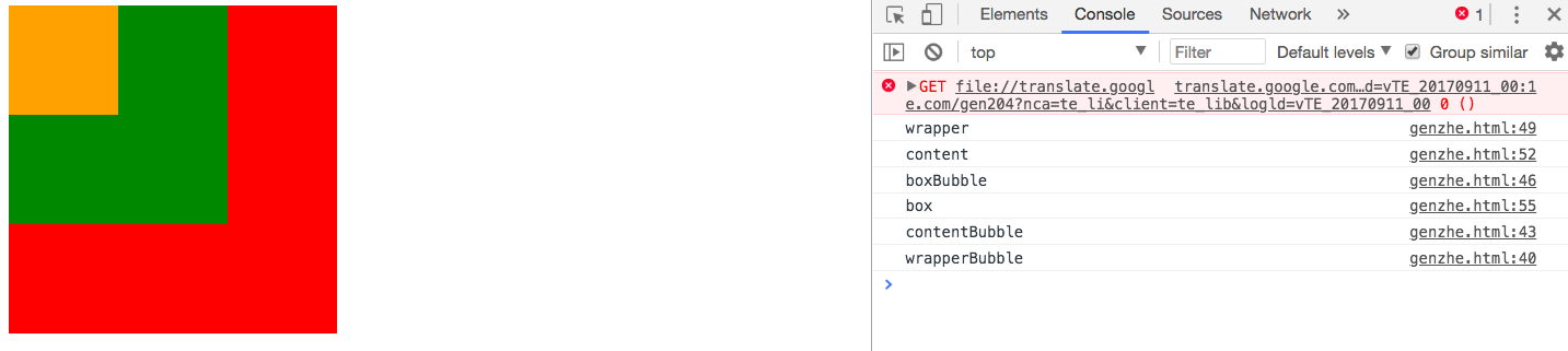 (如下面当点击黄色方框时,依次显示wrapper,content,box,其中wrapper 和content叫做捕获事件并且执行,而box只能叫做事件执行,因为点击的就是box黄色区域,只是进行常规执行)