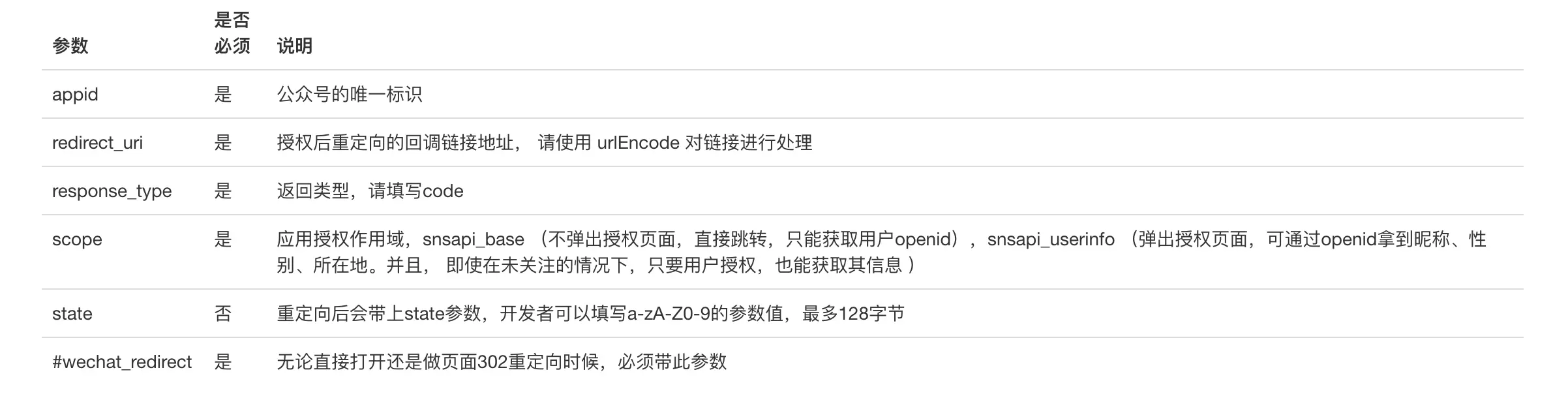 - 注意:对于已关注公众号的用户,用户从公众号的会话或者自定义菜单进入本公众号的网页授权页,即使是