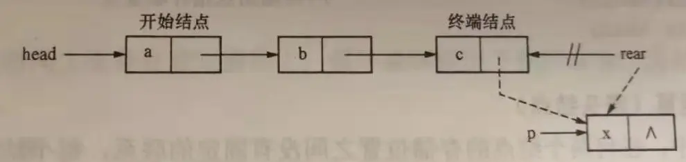 将新结点插入在单链表的表尾上,需增添一个尾指针rear,使其始终指向链表的尾结点。