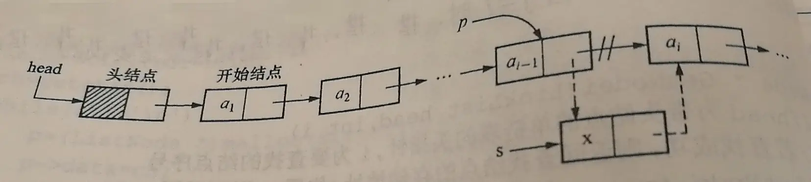 先使p指向ai-1的位置,然后生成一个数据域值为x的新结点*s,再进行插入操作。