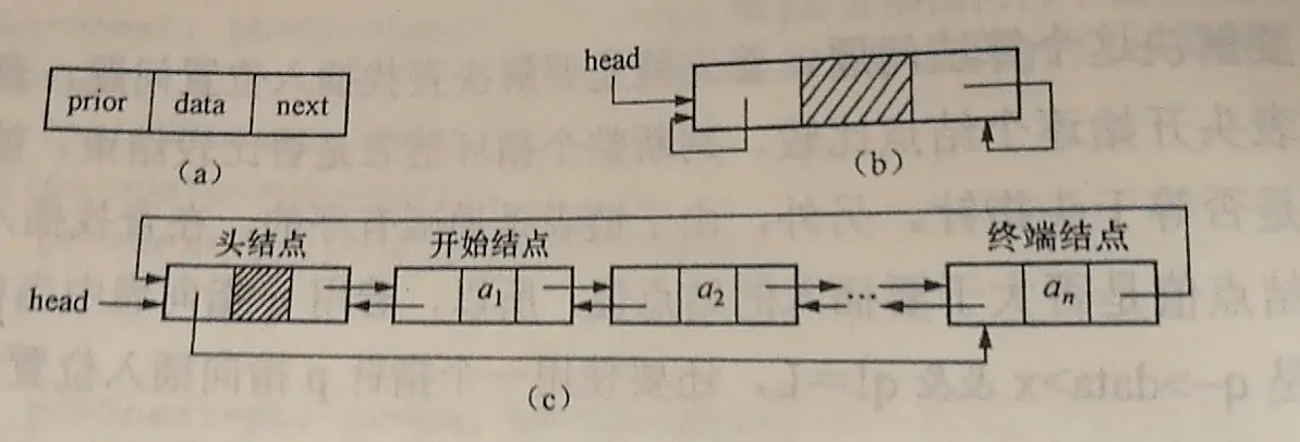 双向链表(线性链表) 若希望从表中快速确定一个结点的直接前趋,只要在单链表的结点类型中增加一个指向其直接前趋的指针域prior即可。这样形成的链表中有两条不同方向的链,因此称为双向链表。
