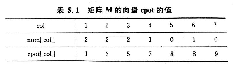 设两个向量:num和cpot num[col]表示矩阵M中第col列中的非零元素个数。 cpot[col]指M中第col列的第一个非零元在b.data中的恰当位置。 有下面两个公式: cpot[1]=1; cpot[col]=copt[col-1]+num[col-1] (col≥2)
