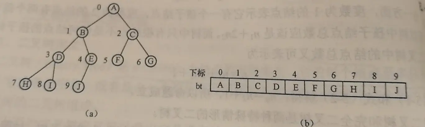 定义:在顺序存储一颗具有n结点的完全二叉树时,只要从树根开始自上到下,每层从左至右地给 该树中每个结点进行编号(假设编号从0开始),就能够得到一个反映整个二叉树结构的线性序列 。然后以各接待你的编号为下标,把每个结点的值对应存储到一个一维数组bt中。 完全二叉树的编号特点编号特点: a.若 i>1,则 k i 的双亲编号为⌊i/2⌋;若 i=1,则 K i 是根结点,无双亲; b.若 2i≤n,则 K i 的左孩子的编号是 2i;否则,K i 无左孩子,即 Ki 必定是叶子。因此完全二叉树中编号 i>⌊n/2⌋的结点必定是叶结点; c.若 2i+1≤n,则 K i 的右孩子的编号是 2i+1;否则,K i 无右孩子; d.若 i 为奇数且不为 1,则 K i 的左兄弟的编号是 i-1;否则,K i 无左兄弟; e.若 i 为偶数且小于 n,则 K i 的右兄弟的编号是 i+1;否则,K i 无右兄弟; -
