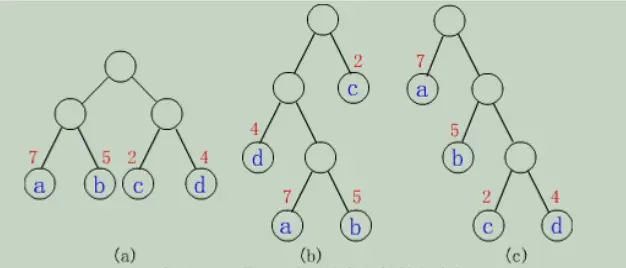 定义:在权为wl,w2,…,wn的n个叶子所构成的所有二叉树中,带权路径长度最小(即代价最小)的二叉树称为最优二叉树或哈夫曼树。 树的路径长度是从树根到树中每一结点的路径长度之和。在结点数目相同的二叉树中,完全二叉树的路径长度最短。 结点的权:在一些应用中,赋予树中结点的一个有某种意义的实数。 结点的带权路径长度:结点到树根之间的路径长度与该结点上权的乘积。 树的带权路径长度:定义为树中所有叶结点的带权路径长度之和,通常记为: 其中:n 表示叶子结点的数目,wi和li分别表示叶结点ki的权值和根到结点ki之间的路径长度。 树的带权路径长度亦称为树的代价。 性质: a.叶子上的权值均相同时,完全二叉树一定是最优二叉树,否则完全二叉树不一定是最优二叉树; b.最优二叉树中,权越大的叶子离根越近; c.最优二叉树的形态不唯一,WPL 最小;(a)WPL=7*2+5*2+2*2+4*2=36 (b)WPL=7*3+5*3+2*1+4*2=46 (c)WPL=7*1+5*2+2*3+4*3=35 其中(c)树的 WPL 最小,可以验证,它就是哈夫曼树。