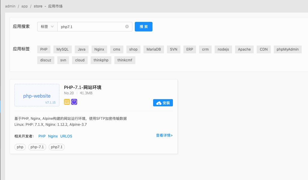 登录URLOS系统后台,在应用市场中搜索“php7.1”,找到之后,选择合适的版本点击安装按钮
