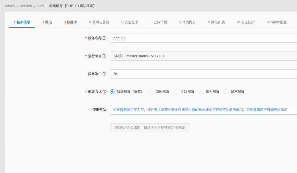 填写服务名称、选择运行节点、服务端口、选择智能部署