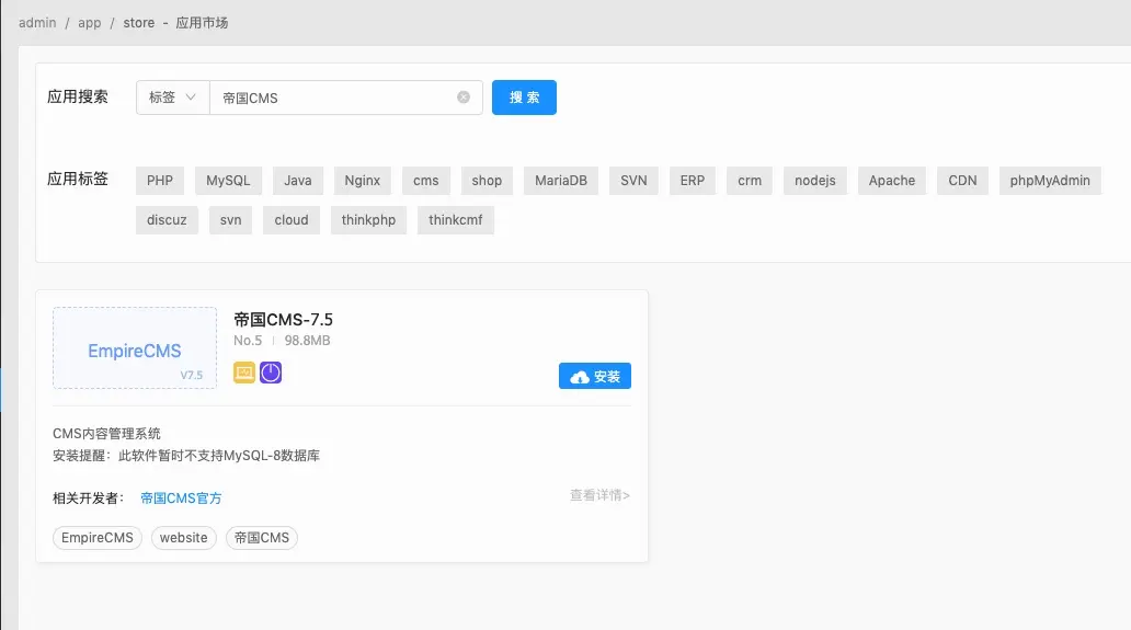 登录URLOS系统后台,在应用市场中搜索“帝国cms”,找到之后,选择合适的版本点击安装按钮