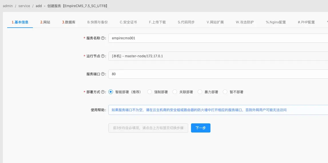 填写服务名称、选择运行节点、服务端口、选择智能部署