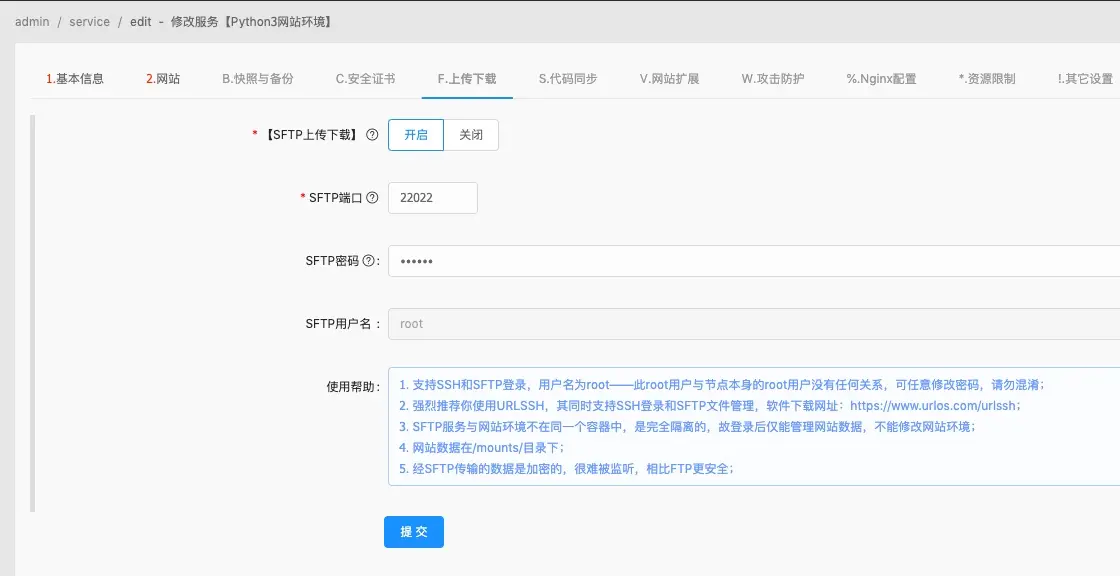 设置SFTP 选择“上传与下载”选项卡,开启SFTP上传下载并填写SFTP端口、SFTP密码;