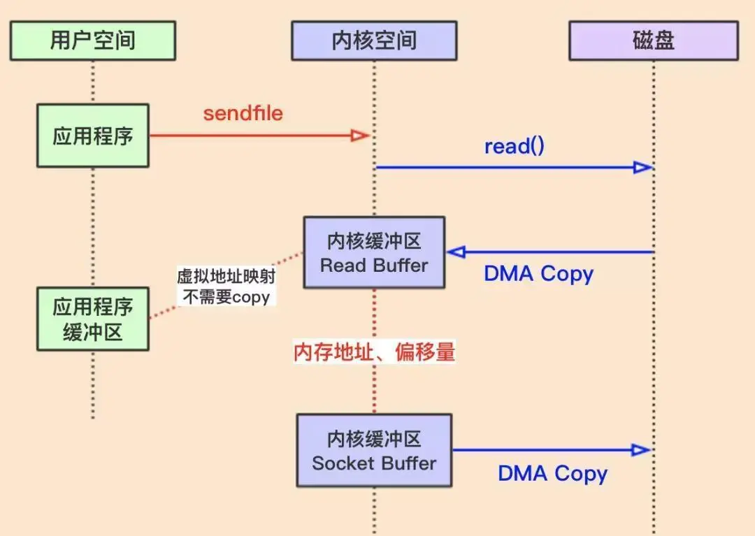 整体流程的核心区别就是,把数据读取到内核缓冲区后,应用程序进行写入操作时,直接是把内核的Read Buffer的数据复制到 Socket Buffer 以便进行写入,这次内核之间的复制也是需要CPU参与的。