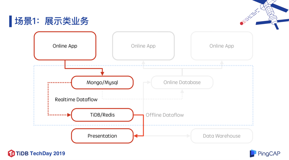 TiDB 在小红书的第一个应用场景是展示类业务,它的 pipeline 如图 4 中红色部分所示,线上一般是 MongoDB 或者 MySQL,通过一条实时数据流(realtime dataflow) 连接 Redis 或者 TiDB,最后实现 presentation 功能。接下来介绍这类场景下的两个具体项目。